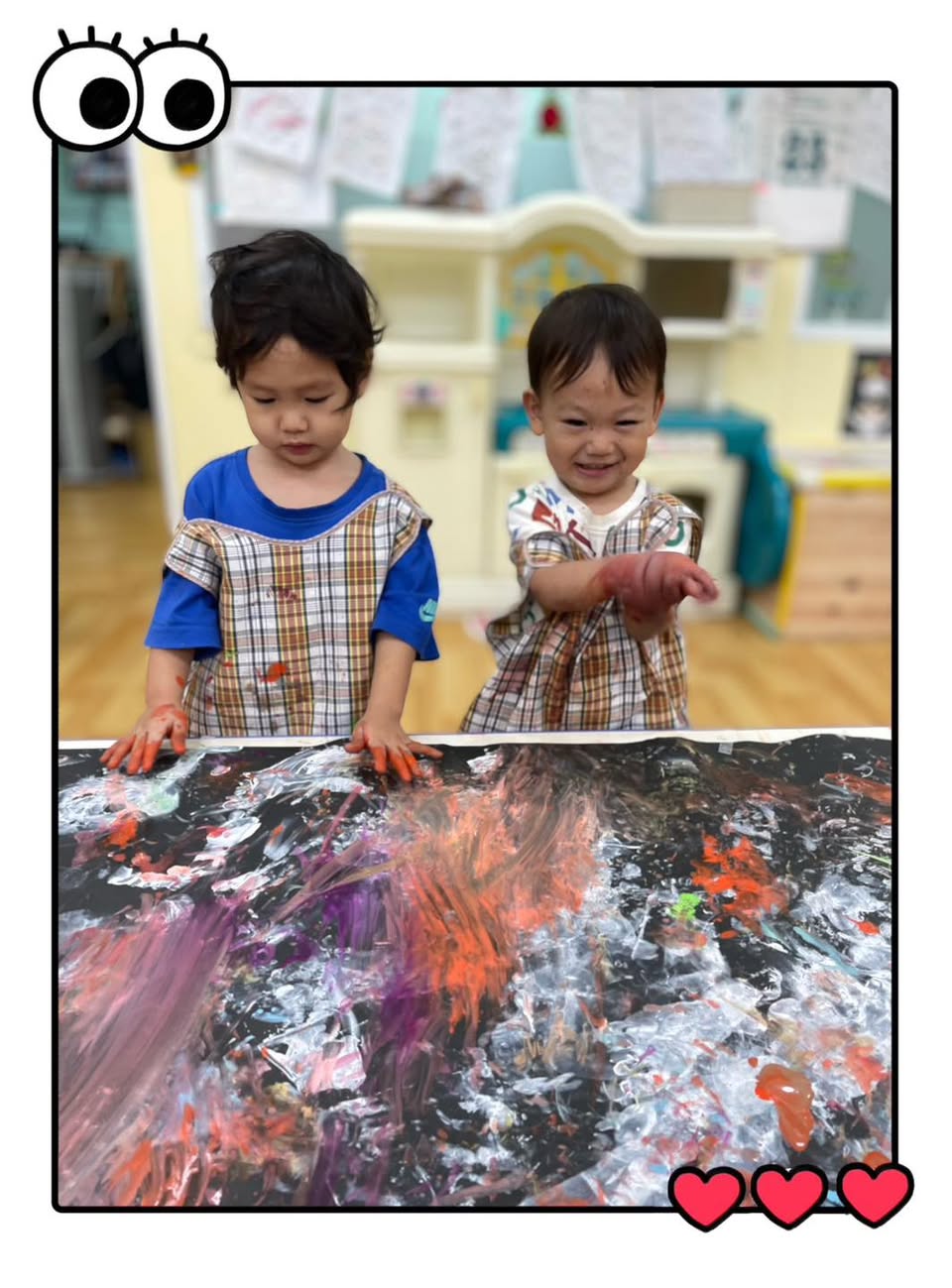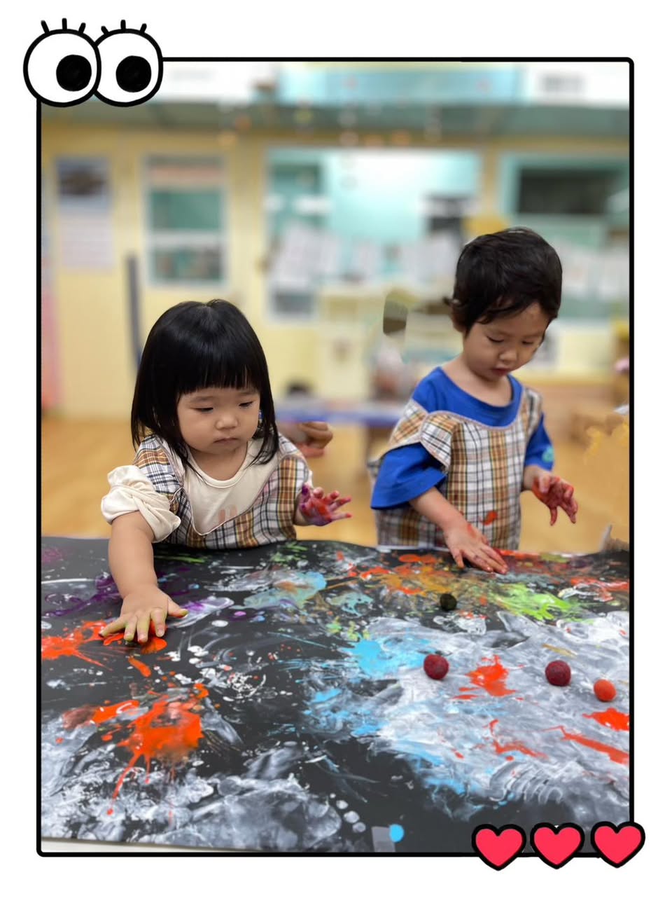 大家看!孩子們專注的小臉蛋和充滿好奇的小手,正在這片黑色的畫紙上盡情揮灑色彩!