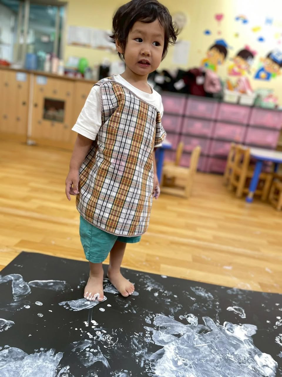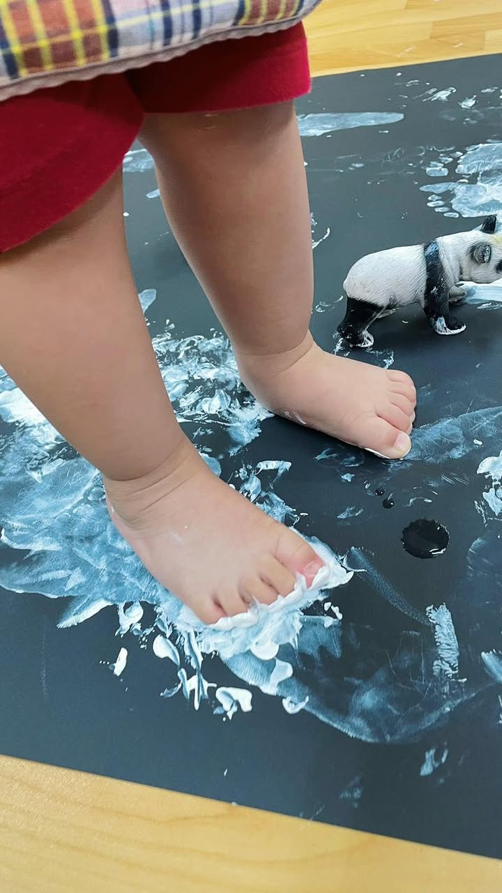 感覺統合 (觸覺刺激)-讓孩子用腳丫直接踩踏冰涼、黏稠的顏料,提供大量的觸覺刺激。