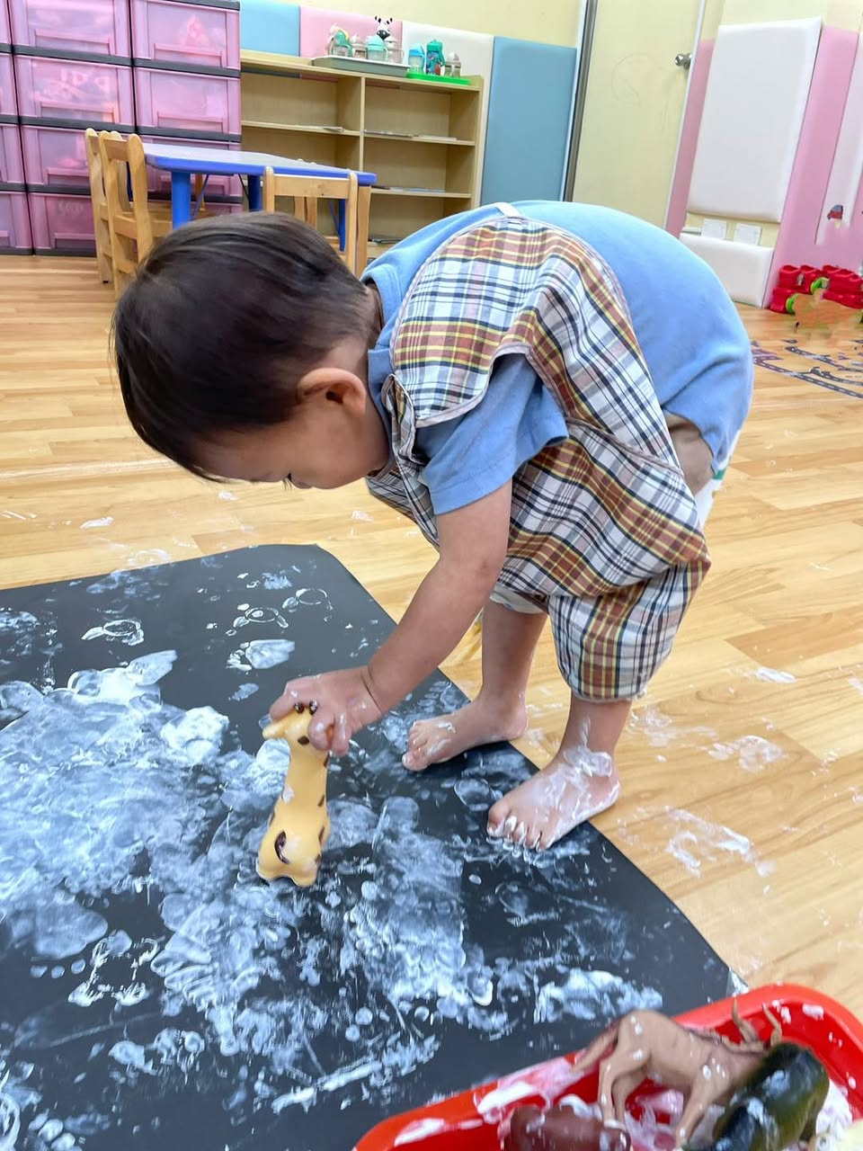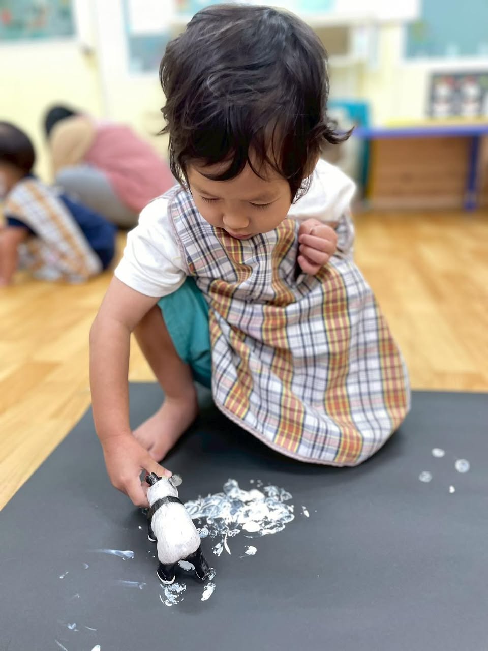 看看這專注的小臉蛋,用腳丫踩踏顏料的感覺一定很新奇!腳印和動物印章,創造出獨一無二的作品。