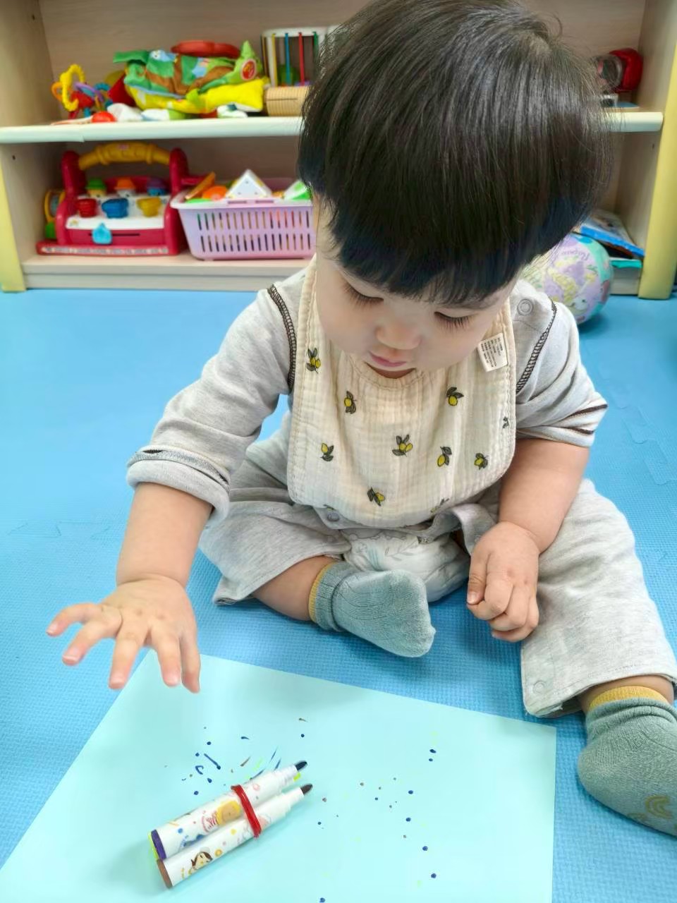 寶貝專注的小模樣!拿起畫筆在紙上恣意揮灑,