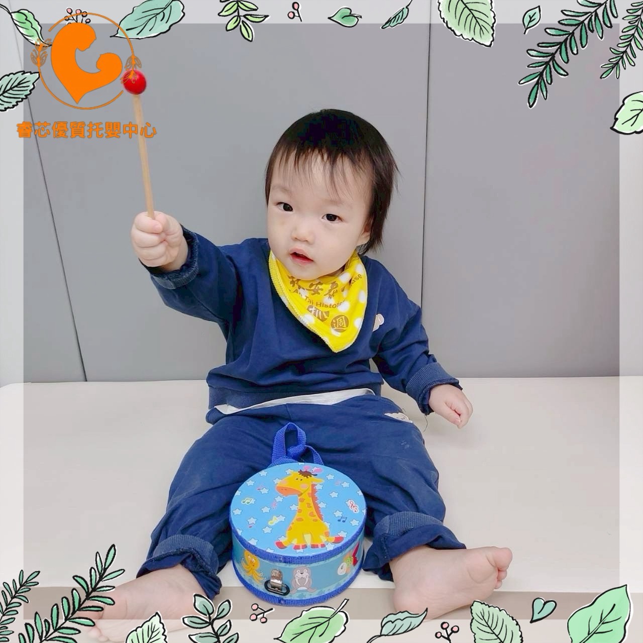 坐在老師懷裡,練習打鼓、無論是用鼓棒或是小手拍打