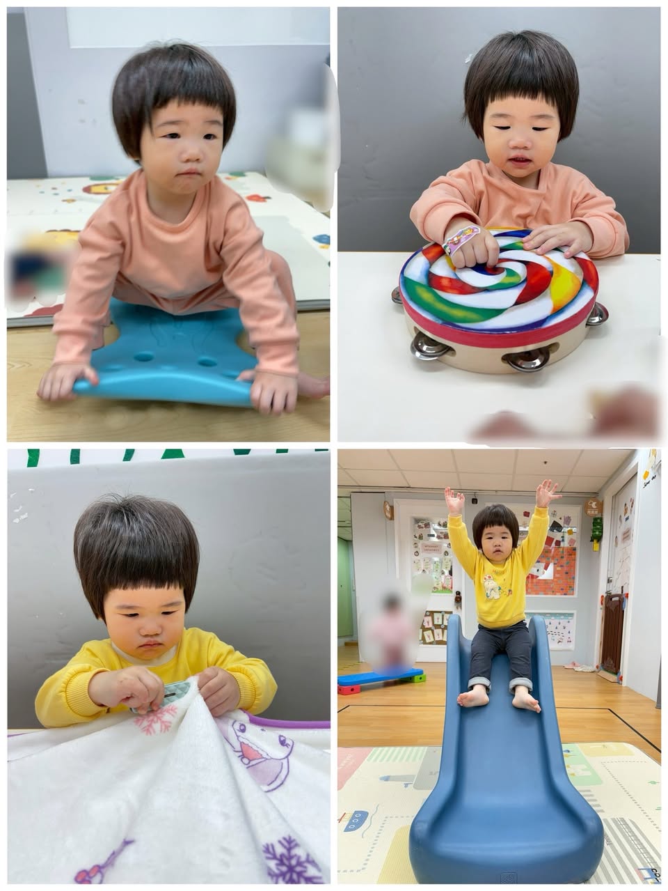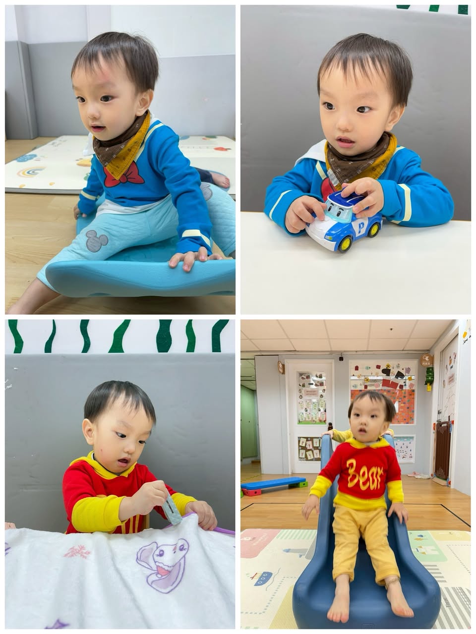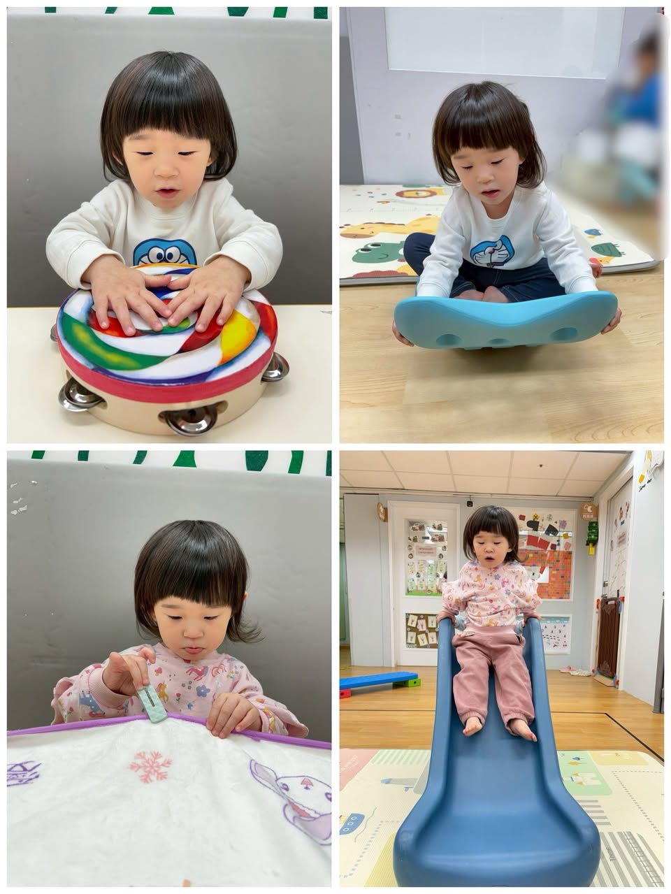 大肌肉活動時,孩子們坐上「搖滾威力」練習保持平衡,感受身體的穩定與控制;溜滑梯更是寶貝們的最愛,一次又一次地滑下來,笑聲在空氣中飛揚。
