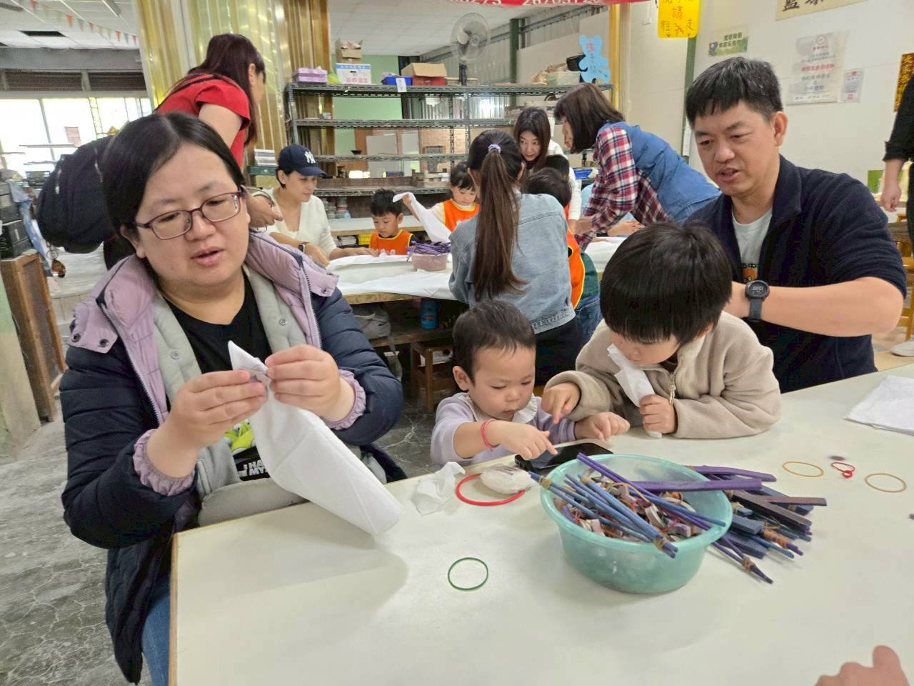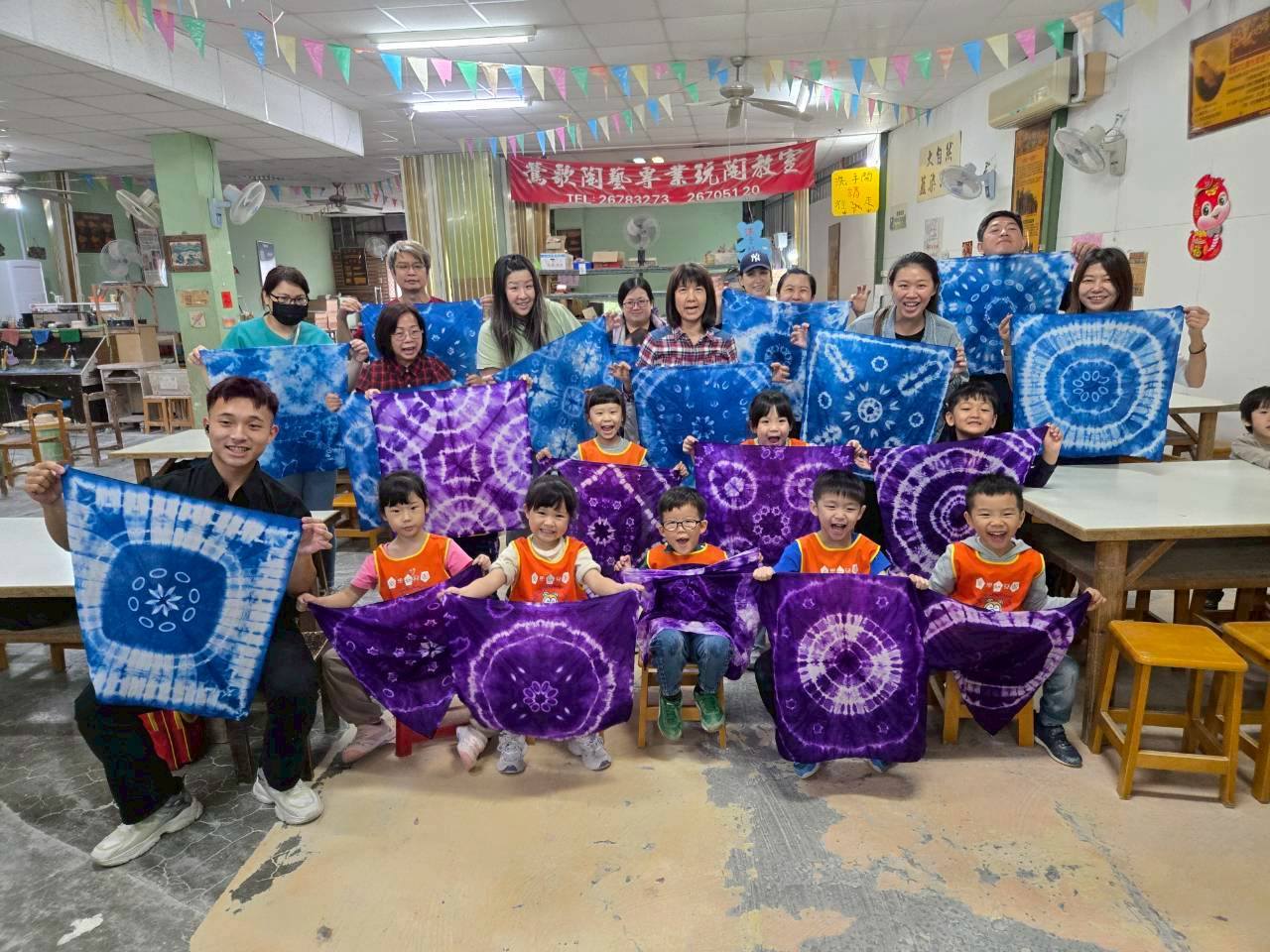 在老師帶領下將布料綁紥、浸染,看著深藍色、紫色逐層帶出漂亮的紋路,這份獨特的手作成品,是屬於每個家庭的藍紫色回憶。