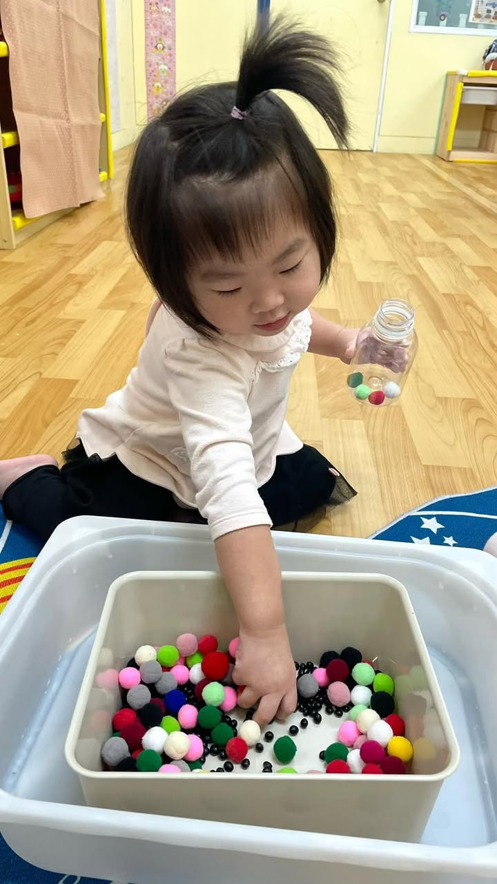🖐️👀感官探索-觸摸柔軟的毛球與硬實的小黑豆,感受截然不同的質地。