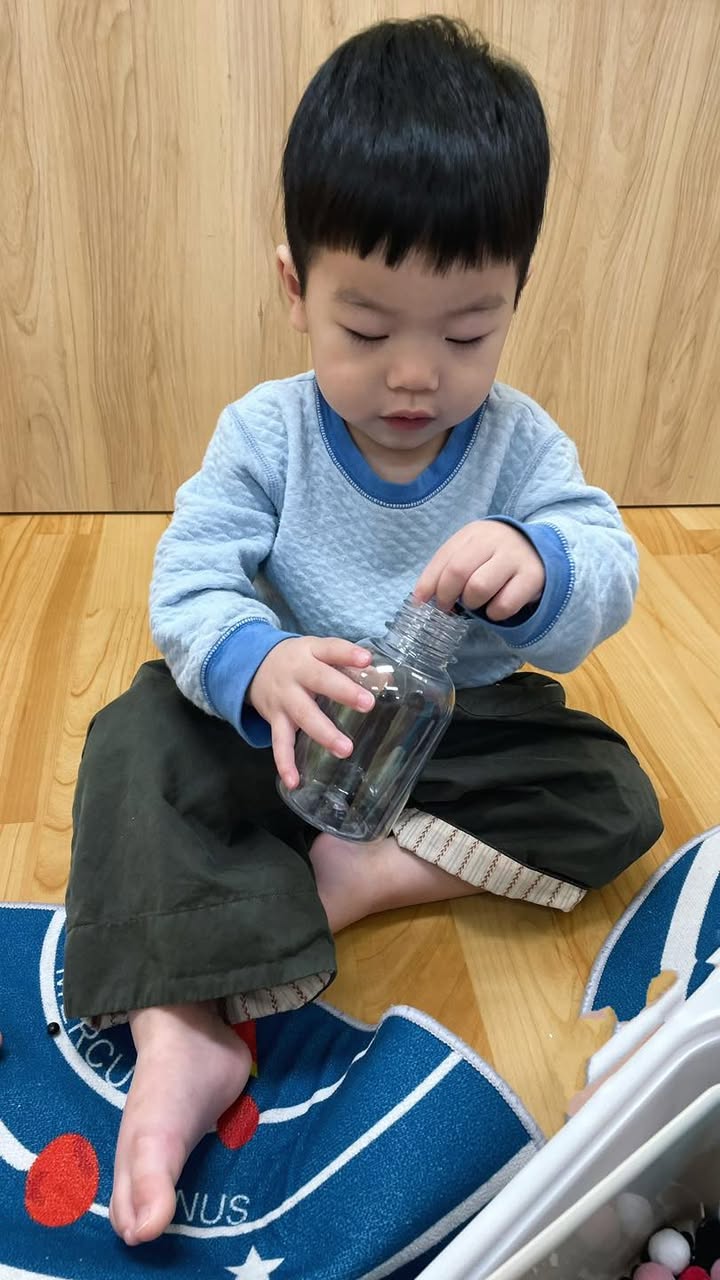 叮叮噹!聖誕節腳步近了。今天寶貝們化身為聖誕小幫手,正專注地進行「小毛球入瓶」的精細動作練習。