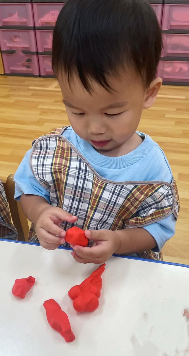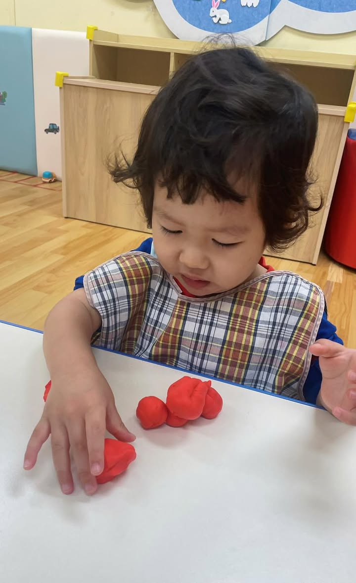 老師說今天要玩黏土搓圓圓,做一顆紅色的蘋果。從拿黏土、到認真搓揉的每個小細節,小手手都超有戲!