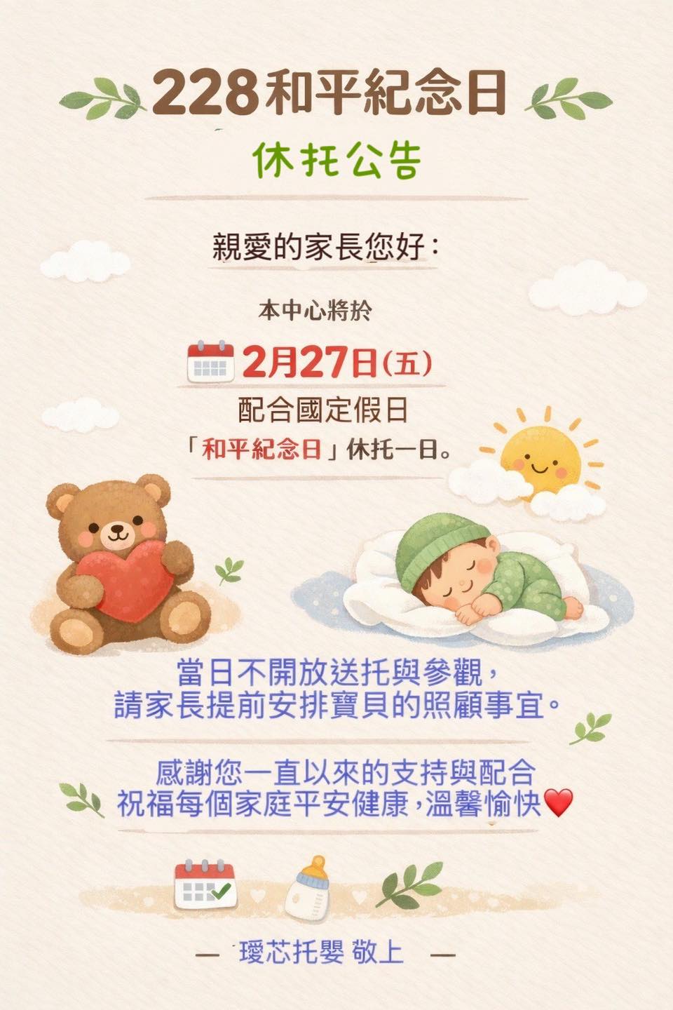 首頁 最新消息 📢 【璦芯托嬰 休托公告】 生活剪影 📢 【璦芯托嬰 休托公告】 2026-02-26 📢 【璦芯托嬰 休托公告】 親愛的家長您好: 配合國定假日,本中心將於 2月27(五)休托一日。 詳細內容請參閱下圖公告。 祝大家假期愉快、平安健康!❤️ 上一頁上一篇年節喜氣洋洋!看著寶貝們穿上可愛的服裝,是不是也感受到滿滿的福氣呢? 🥰👶 下一篇【小手畫大燈籠】🏮✨下一篇 相關消息 生活剪影 2026-03-13 看著孩子們認真探索世界的小臉龐,心裡總是充滿感動! 🥰 見全文 生活剪影 2026-03-13 育兒路上,每個階段都有不同的挑戰和驚喜! 見全文 生活剪影 2026-03-13 這次防震演練活動 見全文 生活剪影 2026-03-12 2026.03.12 見全文