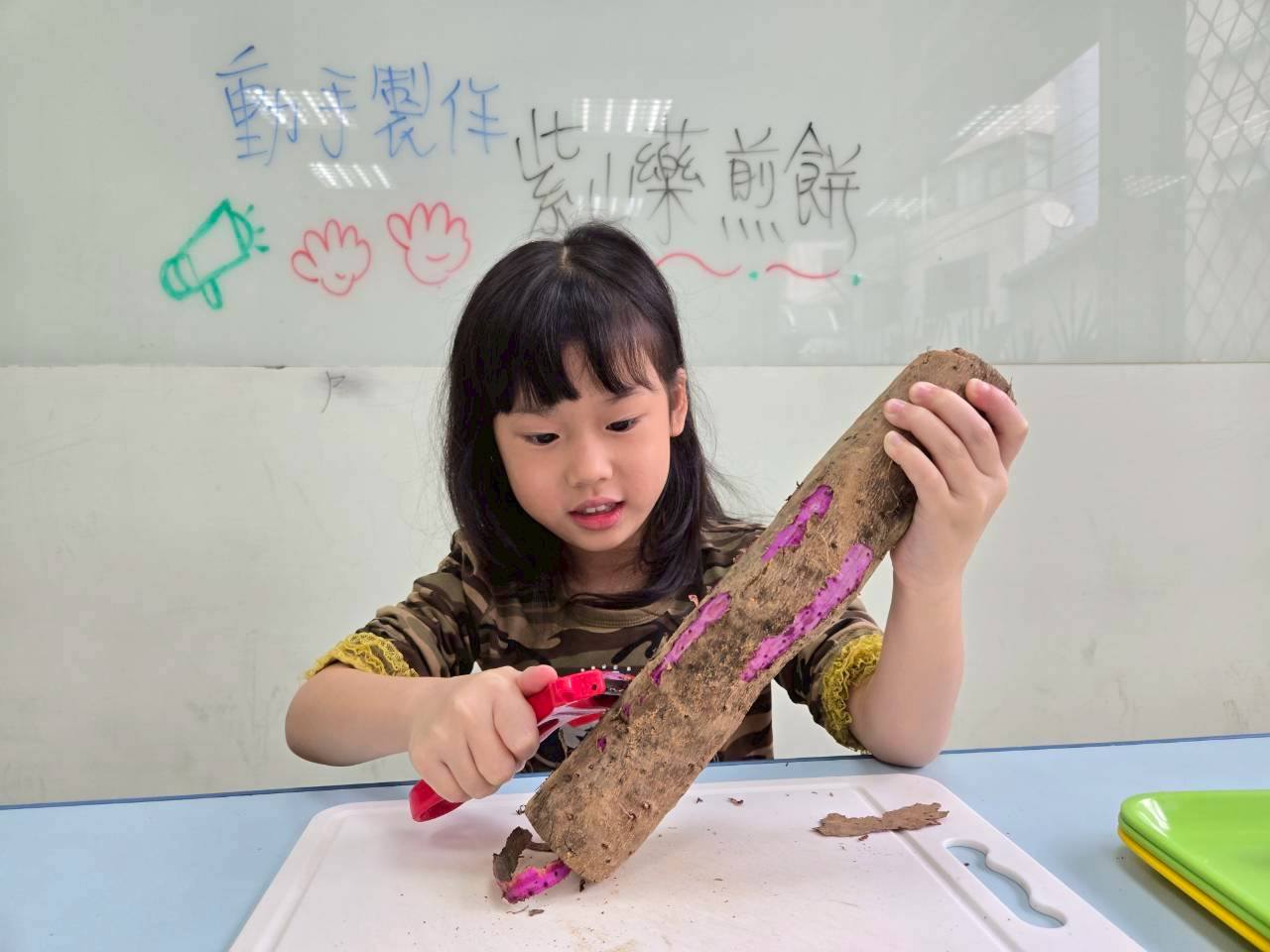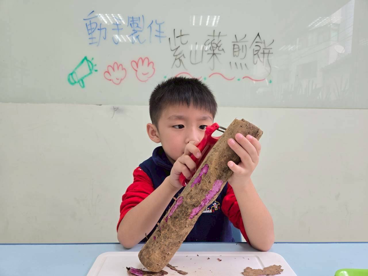 活動中,寶貝們會親手觸摸食材,感受山藥滑滑黏黏的獨特質地,觀察切開後紫色山藥的樣子,並學習如何將材料混合、攪拌、舀入平底鍋。