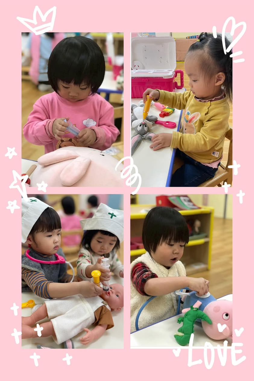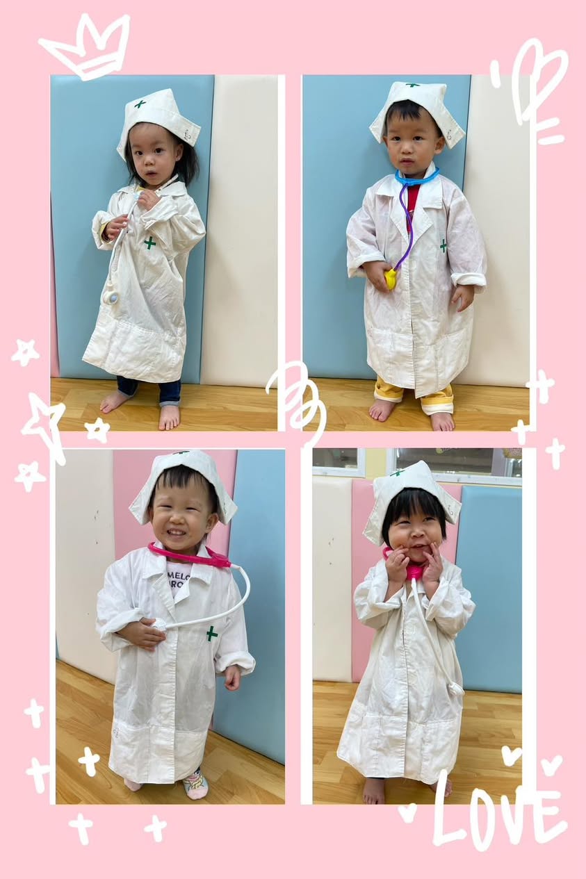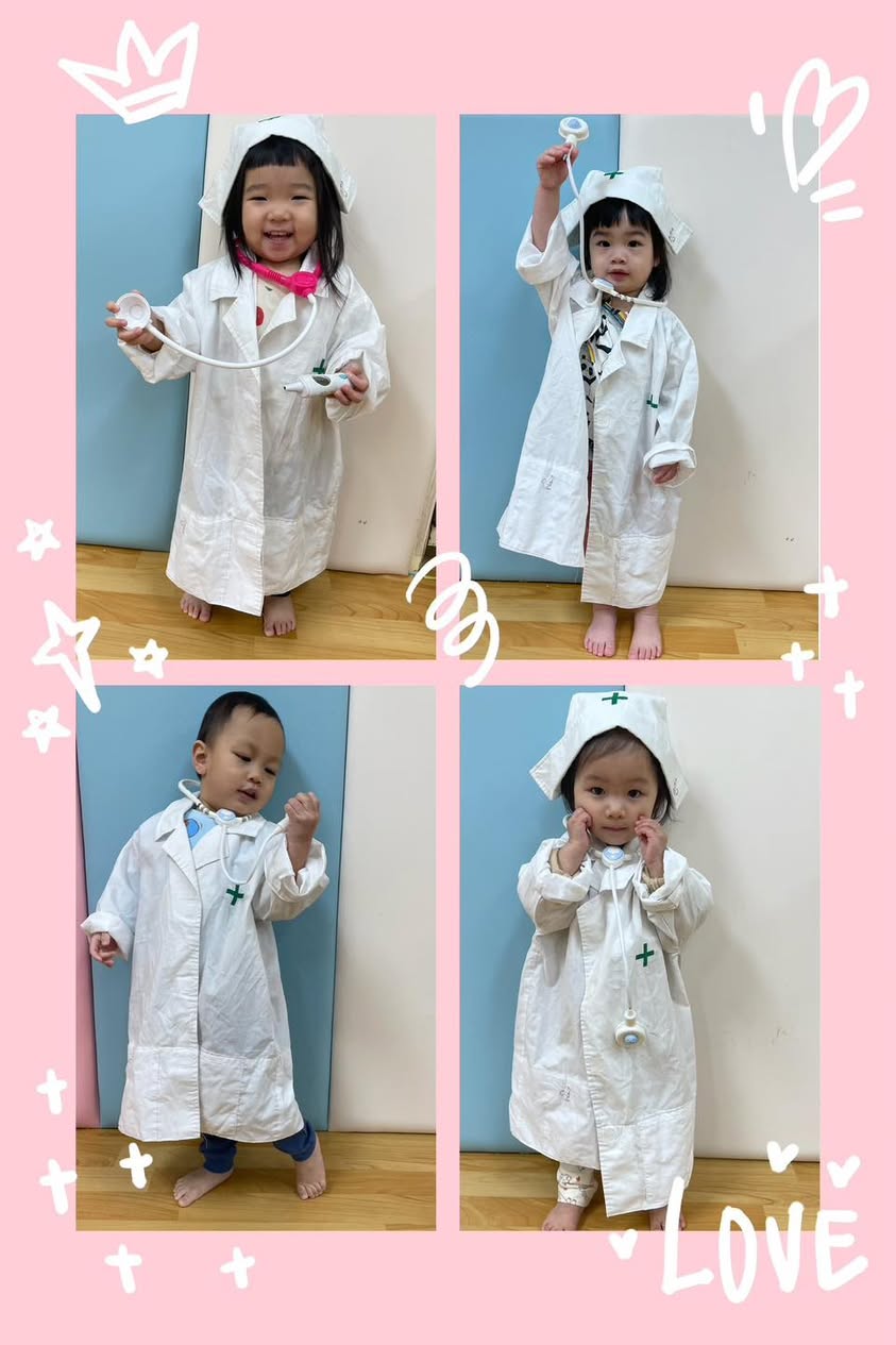 今天璦芯托嬰中心變身小小診所!看著寶貝們穿上白袍、拿起聽診器,認真「問診」的模樣,真的讓老師們心都融化了。🥰